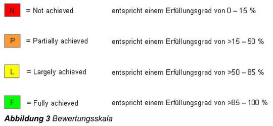 Zur Bewertung der Prozessattribute gibt es eine Ordinalskala, mit deren Hilfe der Erfüllungsgrad eines Prozessattributes angegeben werden kann. Die Skala (Bild 3) enthält vier mögliche Werte. Damit kann man neben vollständiger Erfüllung bzw. Nichterfüllung zwei Zwischenwerte vergeben. ISO/IEC 15504 definiert auch die Anforderungen an den Prozess, der mit einem Assessment verbunden ist. Diese Anforderungen erstrecken sich auf die Planung eines Assessments, die Erhebung und Validierung der Daten, die zur Bewertung der Prozesse herangezogen werden, die Bewertung der Prozessattribute und das Berichtswesen.