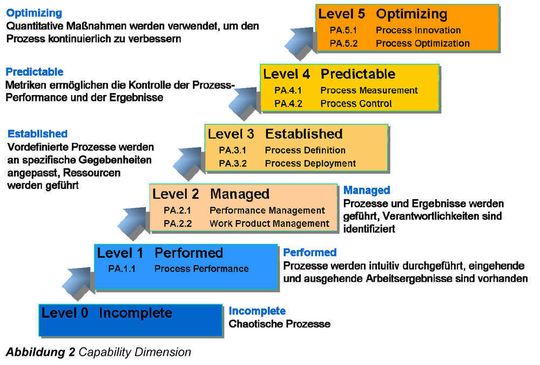 Neben der Prozessdimension gibt es die so genannte Fähigkeitsdimension (Capability Dimension), die die Reife von Prozessen misst (Bild 2). Die Reife wird dabei in Level angegeben, wobei 0 eine unzureichende und 5 eine sehr hohe Reife darstellt. Prozesse werden immer separat bewertet, d.h. für jeden einzelnen Prozess ergibt sich als Ergebnis der Bewertung ein Level. Dieser wird jedoch nicht direkt vergeben. Stattdessen werden Prozessattribute, also Eigenschaften von Prozessen bewertet und aus deren Bewertung der Level abgeleitet. Um die Attribute des Prozesses zu bewerten, werden die bereits erläuterten generischen Praktiken als Indikator verwendet. Bild 2 zeigt nicht nur, welche Prozessattribute prinzipiell existieren, sondern veranschaulicht auch die Schwerpunkte, die auf dem jeweiligen Level liegen. Die Level sind übrigens kumulativ zu verstehen, d.h. ein Level kann nur dann erreicht werden, wenn die Anforderungen der darunter liegenden Level bzw. Prozessattribute vollständig erfüllt wurden.
