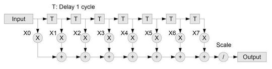 Ein einfacher und bekannter FIR-Filter ist der „Gleitender-Mittelwert“-Filter. Dieser wird gerne als einfacher Tiefpass-Filter zum Glätten von Messwerten eingesetzt. Dabei sind alle Filterkoeffizienten gleich und werden so normiert, dass ihre Summe und somit die Gleichspannungsverstärkung des Filters gleich eins wird. Der µDSP des MB91470 kann einen solchen Filter mit 64 Stufen in rund 1,2 µs berechnen. Damit kann die volle Samplingrate der beiden 12-Bit-A/D-Wandler des MB91F479 genutzt werden. Ebenso können in der gleichen Zeit auch mehrere kürzere Filter berechnet werden.