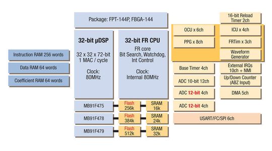 Immer häufiger ist jedoch keine so klare Einordnung möglich: Auch eine Steuereinheit muss evtl. auf digitale Filter zurückgreifen, um Systemzustände auszuwerten oder schnelle Regelschleifen auszuführen. Gerade im Bereich der Motorsteuerungen ist dies häufig der Fall, weshalb Fujitsu seine auf Motor-/Antriebssteuerungen ausgerichteten 32-Bit-MCUs der MB91470/480-Serie mit leistungsfähiger Peripherie ausgestattet: dem „µDSP“, der eine MAC-(Multiply-Accumulate-)Einheit darstellt.