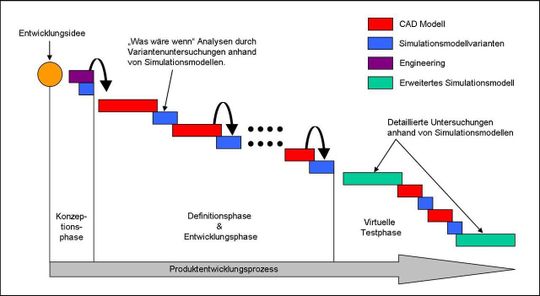Die Lösung des Problems: Überwindung spezifischer Entwicklungsprobleme und Realisierung neuer Entwicklungswege. Daraus ergeben sich wirtschaftliche Vorteile. Wie in Bild 1 ersichtlich ist, unterscheidet sich der Entwicklungsprozess durch den Einsatz der Strömungssimulationssoftware erheblich von einem klassischen Prozess. Die Abbildung verdeutlicht die wirtschaftlichen Vorteile durch diese Art des Produktentwicklungsprozesses.