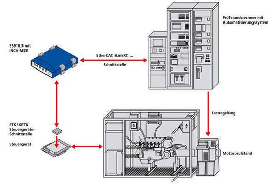 Mit INCA-MCE (Measurement and Calibration Embedded) können Mess- und Applikationsfunktionen auf dem ES910-Modul ausgeführt werden. Der schnelle Zugriff auf das Steuergerät erlaubt es darüber hinaus, Reglerfunktionen vom Steuergerät auf die Prüfstandsautomatisierung für Test- und Entwicklungszwecke auszulagern. Die intelligente, echtzeitfähige ES910-Hardware sorgt für den direkten Austausch von Daten zwischen Prüfstand und Steuergerät. INCA-MCE kann manuell oder vollautomatisiert per Prüfstandsschnittstelle konfiguriert werden.