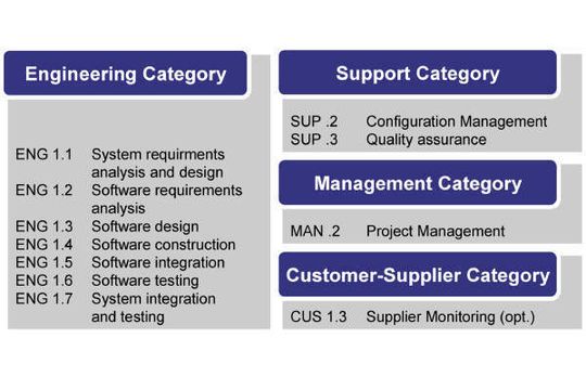 Grundlage hierfür ist SPICE (ISO/IEC 15504), ein Verfahren zur Bewertung von Software-Entwicklungsprozessen. Ein Assessment liefert ein aussagefähiges Profil der untersuchten Software-Entwicklungsprozesse und damit erste Ansatzpunkte für deren Verbesserung. Der Kern von Automotive SPICE zeigt Schwerpunkte des Modells zum einen im eigentlichen Entwicklungsverfahren, zum anderen in der Management Disziplin auf. Die Prozesse des QA und des Configuration Managements unterstützen das Management, wie auch die Softwareentwicklung. Das Supplier Monitoring erhält einen hohen Stellenwert, wenn mit weiteren Lieferanten gearbeitet wird (Bild 2). Die Verteilung der Aufgaben auf weitere Outsourcing Partner ist in den Zeiten von Softwareentwicklungs-Outsourcing ein immer häufiger anzutreffender Umstand. Dieser Anforderung muss auch im Sinne einer Prozessoptimierung Rechnung getragen werden.