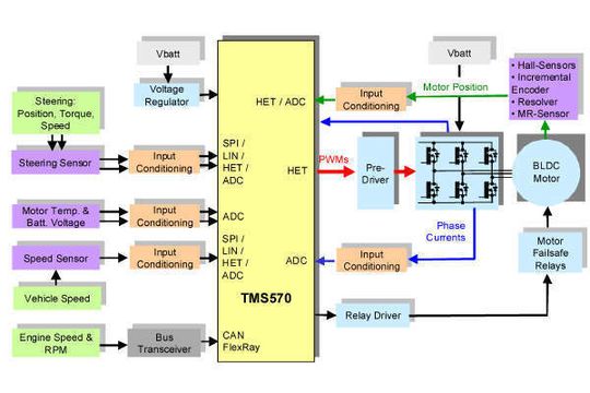 Bei einem EPS-System regelt das Steuergerät hauptsächlich den Elektromotor, der in Abhängigkeit des am Lenkrad vom Fahrer erzeugten Drehmoments zusätzliche Lenkkraft über die entsprechende Mechanik auf die Räder ausübt. Es werden sowohl dreiphasige Asynchron- als auch Synchronmotoren eingesetzt. Wegen ihrer guten Effizienz, der hohen Leistungsdichte und einem hohen Drehmoment auch bei niedrigen Drehzahlen sind Permanent-Magnet-Synchronmotoren sehr verbreitet.