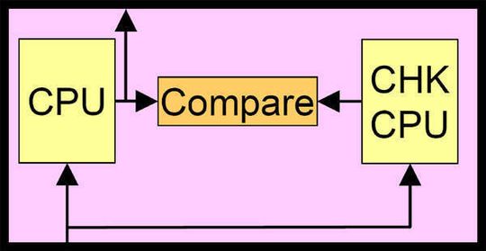 Bei dieser Architektur bearbeiten zwei identische Cortex-R4-CPUs dasselbe Programm. Die Ergebnisse beider Berechnungen werden in jedem CPU-Zyklus miteinander verglichen, um mögliche Fehler zu erkennen und darauf zu reagieren.