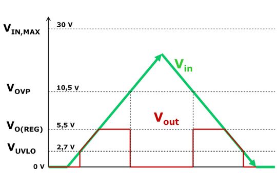 Bei Eingangsspannungen oberhalb des Wertes VOVP wird der Schutz-FET Q1 abgeschaltet und somit die Stromabgabe an den Ausgang unterbrochen. Die Schaltung muss dabei äußerst schnell reagieren und den FET in weniger als 1 μs abschalten. Dem System kann dieser Zustand mittels eines FEHLER-Signals mitgeteilt werden. Geht die Eingangsspannung danach auf einen Wert unterhalb von VOVP (abzüglich einer Hysteresespannung Vhys(OVP)), aber oberhalb von VUVLO zurück, wird der Schutz-FET wieder eingeschaltet, wenn nach Ablauf der Deglitch-Zeit tON(OVP) sichergestellt ist, dass sich die Eingangsspannung stabilisiert hat.