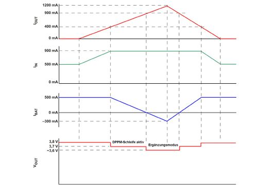 Die Einstellung der Eingangsstrombegrenzung wird über den Zustand der Anschlüsse EN1 und EN2 gesteuert. Wird der Strom durch entsprechende Programmierung eines Widerstands begrenzt, wird die Eingangsstrombegrenzung durch den Wert des Widerstands zwischen ILIM-Anschluss und VSS geregelt. Ist bei IN eine Spannungsquelle angeschlossen, hat die Systemlast Priorität vor dem Laden des Akkus. Der DPPM-Modus und der Akku-Ergänzungsmodus dienen dazu, die Systemlast weiter mit Strom zu versorgen. Entsprechende Beispiele zu den DPPM- und Ergänzungsmodi sind in Bild 4 dargestellt.