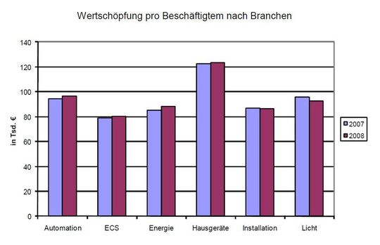 Der Umsatz pro Mitarbeiter ist eine bekannte und einfach zu ermittelnde Größe. Die Wertschöpfung pro Mitarbeiter ist jedoch aussagekräftiger, da sie sich auf die erbrachte Eigenleistung des Betriebes bezieht. Die Wertschöpfung wird vereinfacht als Umsatz abzgl. Materialaufwand berechnet, wobei die Materialaufwandsquote gemäß Gesamtkosten-verfahren (§ 275 Abs. 2 HGB) ermittelt wird. Die Wertschöpfung pro Beschäftigtem ist für die gesamte Elektroindustrie um 1,9% auf 98,8 Tausend € gestiegen. Dieser Trend konnte in fast allen Größenklassen und Branchen beobachtet werden. Der Bereich Hausgeräte weist die höchste Wertschöpfung pro Mitarbeiter aus (vgl. Grafik 1).