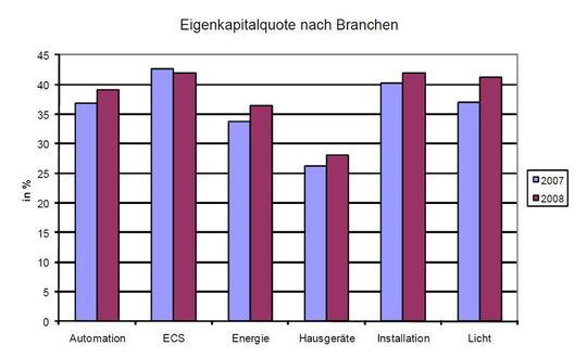 Die Eigenkapitalquote ist für die gesamte Elektroindustrie deutlich gestiegen. Die Unternehmen haben die guten letzten Jahre dazu genutzt, ihre EK-Quote zu erhöhen. Die EK-Quote hat in fast allen Branchen und Größenklassen zugenommen. Die Bereiche ECS, Installation und Licht weisen mit über 41% die höchste Eigenkapitalquote auf (vgl. Grafik 2).